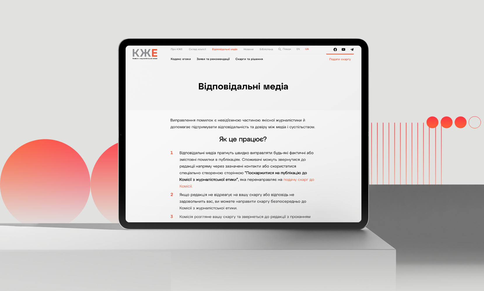 In 2024, the Commission on Journalistic Ethics introduced a new section on its website, Responsible Media. In this section, we explain how media teams can publicly declare their responsible attitude to content, adherence to standards, fixing any identified errors, and how they can integrate the Ethics Code of the Ukrainian Journalist into their websites / media platforms.