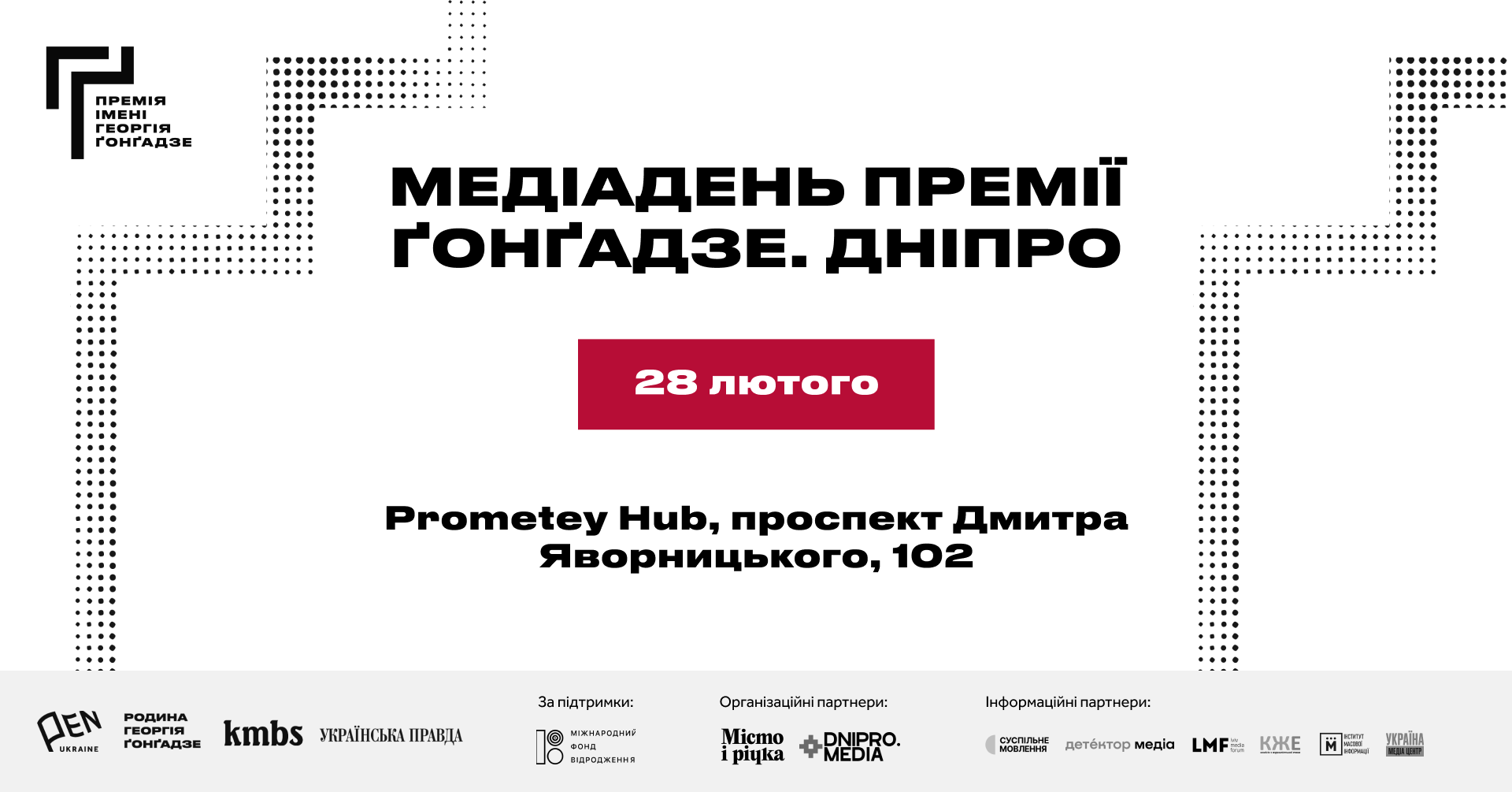 28 лютого у Дніпрі команда Премії імені Георгія Ґонґадзе проведе «Медіадень Премії Ґонґадзе. Дніпро» — подію про журналістику, вплив розслідувань, регіональний досвід та формування спільнот.